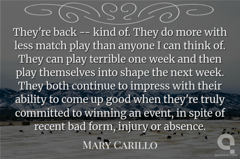 They're back -- kind of. They do more with less match play than anyone I can think of. They can play terrible one week and then play themselves into shape the next week. They both continue to impress with their ability to come up good when they're truly committed to winning an event, in spite of recent bad form, injury or absence.