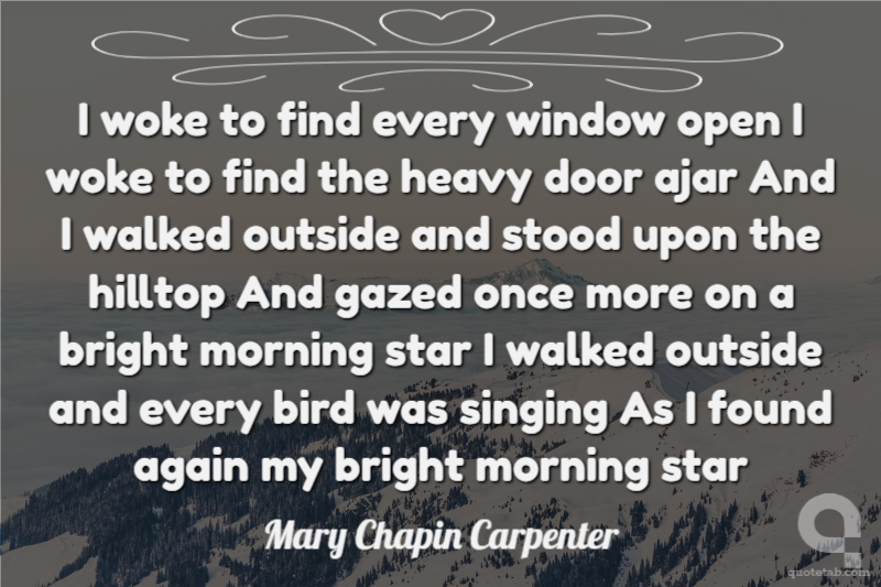 I woke to find every window open I woke to find the heavy door ajar And I walked outside and stood upon the hilltop And gazed once more on a bright morning star I walked outside and every bird was singing As I found again my bright morning star
