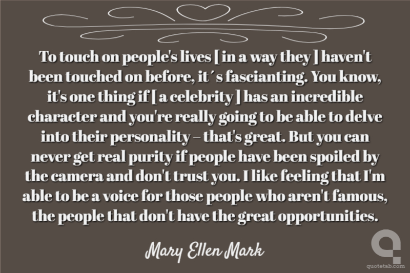 To touch on people's lives [ in a way they ] haven't been touched on before, it´s fascianting. You know, it's one thing if [ a celebrity ] has an incredible character and you're really going to be able to delve into their personality – that's great. But you can never get real purity if people have been spoiled by the camera and don't trust you. I like feeling that I'm able to be a voice for those people who aren't famous, the people that don't have the great opportunities.