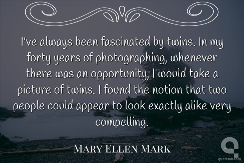 I've always been fascinated by twins. In my forty years of photographing, whenever there was an opportunity, I would take a picture of twins. I found the notion that two people could appear to look exactly alike very compelling.
