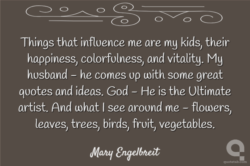 Things that influence me are my kids, their happiness, colorfulness, and vitality. My husband - he comes up with some great quotes and ideas. God - He is the Ultimate artist. And what I see around me - flowers, leaves, trees, birds, fruit, vegetables.