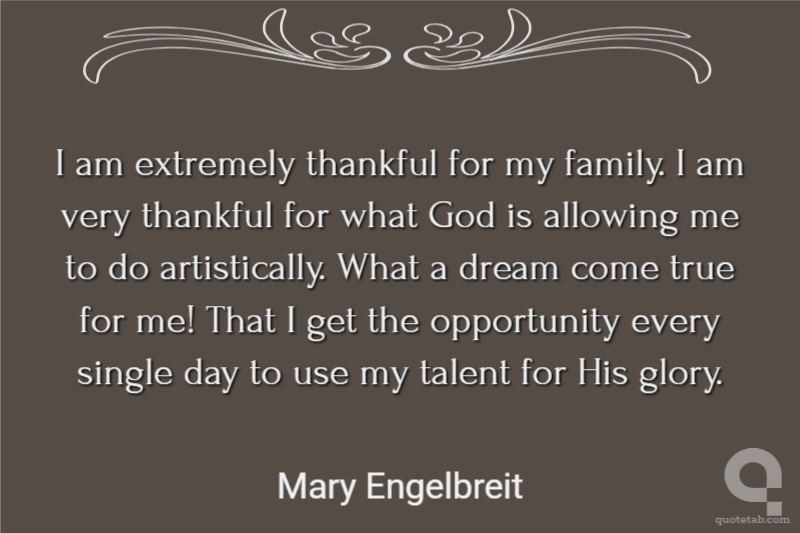 I am extremely thankful for my family. I am very thankful for what God is allowing me to do artistically. What a dream come true for me! That I get the opportunity every single day to use my talent for His glory.