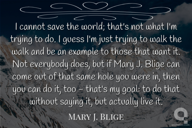 I cannot save the world; that's not what I'm trying to do. I guess I'm just trying to walk the walk and be an example to those that want it. Not everybody does, but if Mary J. Blige can come out of that same hole you were in, then you can do it, too - that's my goal: to do that without saying it, but actually live it.