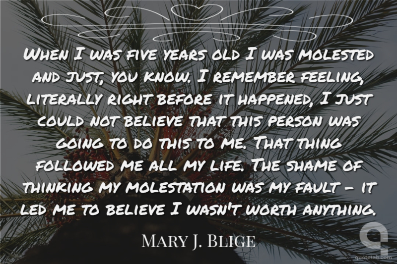 When I was five years old I was molested and just, you know. I remember feeling, literally right before it happened, I just could not believe that this person was going to do this to me. That thing followed me all my life. The shame of thinking my molestation was my fault - it led me to believe I wasn't worth anything.