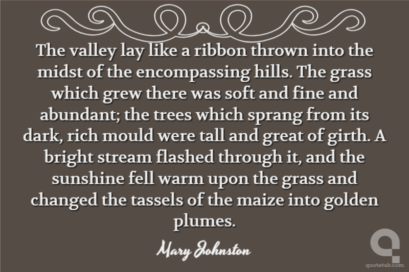 The valley lay like a ribbon thrown into the midst of the encompassing hills. The grass which grew there was soft and fine and abundant; the trees which sprang from its dark, rich mould were tall and great of girth. A bright stream flashed through it, and the sunshine fell warm upon the grass and changed the tassels of the maize into golden plumes.