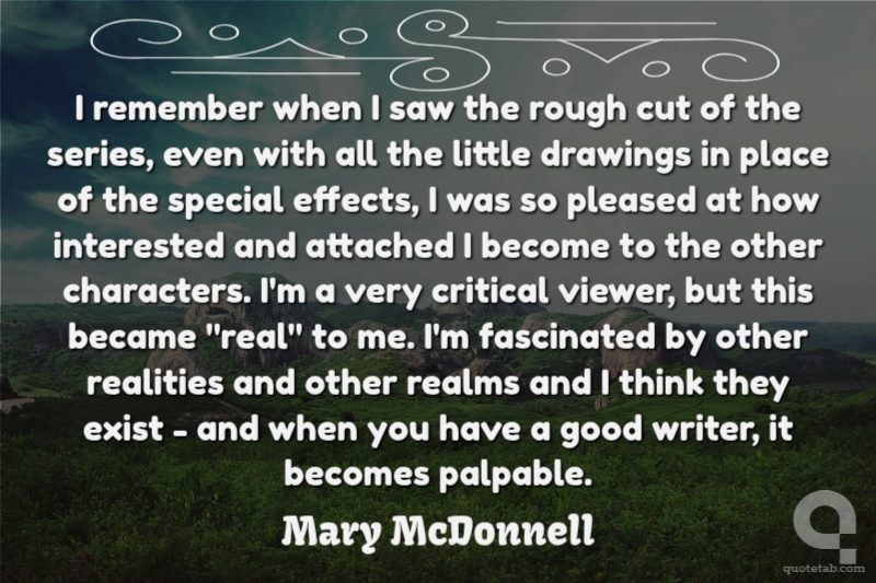 I remember when I saw the rough cut of the series, even with all the little drawings in place of the special effects, I was so pleased at how interested and attached I become to the other characters. I'm a very critical viewer, but this became "real" to me. I'm fascinated by other realities and other realms and I think they exist - and when you have a good writer, it becomes palpable.