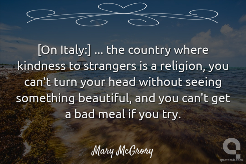 [On Italy:] ... the country where kindness to strangers is a religion, you can't turn your head without seeing something beautiful, and you can't get a bad meal if you try.