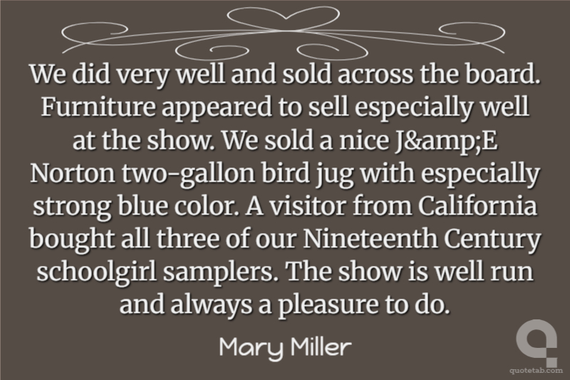 We did very well and sold across the board. Furniture appeared to sell especially well at the show. We sold a nice J&E Norton two-gallon bird jug with especially strong blue color. A visitor from California bought all three of our Nineteenth Century schoolgirl samplers. The show is well run and always a pleasure to do.