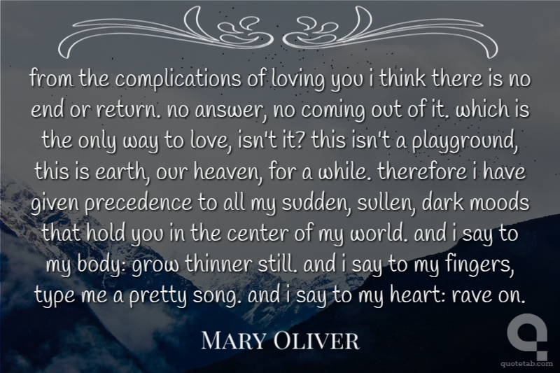 from the complications of loving you i think there is no end or return. no answer, no coming out of it. which is the only way to love, isn't it? this isn't a playground, this is earth, our heaven, for a while. therefore i have given precedence to all my sudden, sullen, dark moods that hold you in the center of my world. and i say to my body: grow thinner still. and i say to my fingers, type me a pretty song. and i say to my heart: rave on.