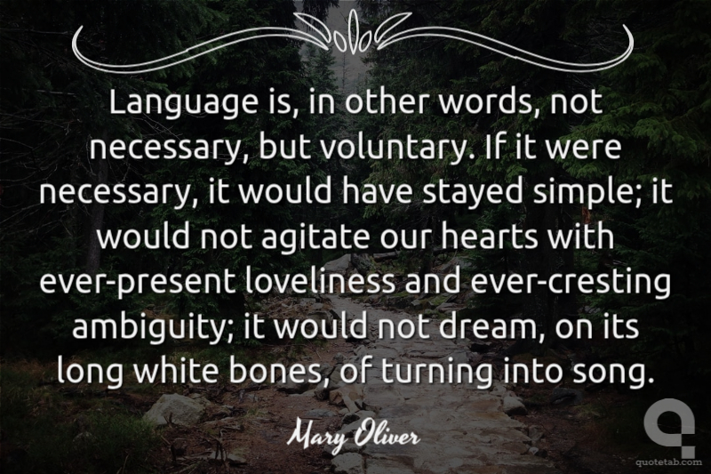 Language is, in other words, not necessary, but voluntary. If it were necessary, it would have stayed simple; it would not agitate our hearts with ever-present loveliness and ever-cresting ambiguity; it would not dream, on its long white bones, of turning into song.