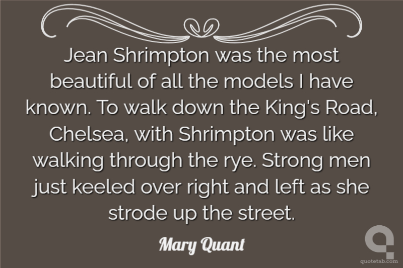 Jean Shrimpton was the most beautiful of all the models I have known. To walk down the King's Road, Chelsea, with Shrimpton was like walking through the rye. Strong men just keeled over right and left as she strode up the street.