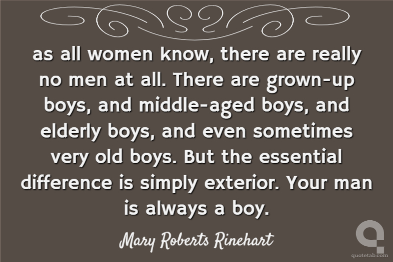 as all women know, there are really no men at all. There are grown-up boys, and middle-aged boys, and elderly boys, and even sometimes very old boys. But the essential difference is simply exterior. Your man is always a boy.