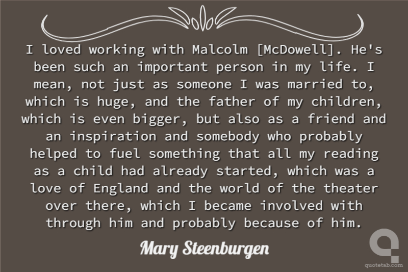 I loved working with Malcolm [McDowell]. He's been such an important person in my life. I mean, not just as someone I was married to, which is huge, and the father of my children, which is even bigger, but also as a friend and an inspiration and somebody who probably helped to fuel something that all my reading as a child had already started, which was a love of England and the world of the theater over there, which I became involved with through him and probably because of him.