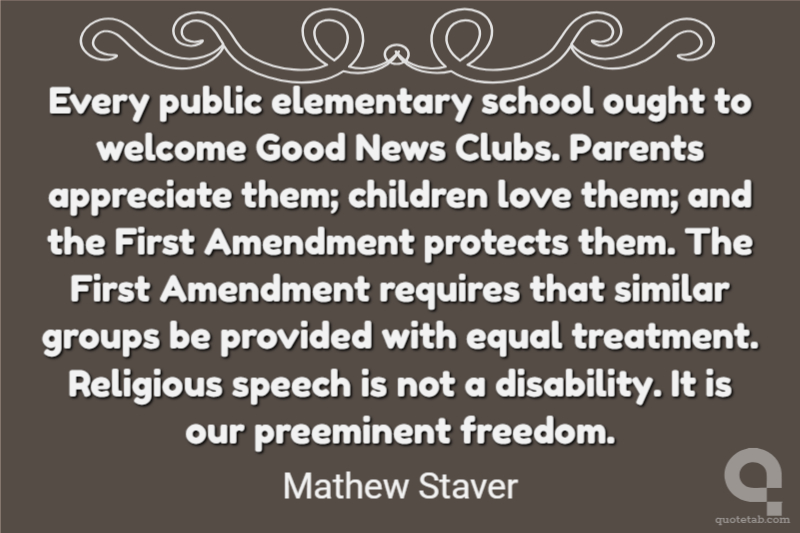 Every public elementary school ought to welcome Good News Clubs. Parents appreciate them; children love them; and the First Amendment protects them. The First Amendment requires that similar groups be provided with equal treatment. Religious speech is not a disability. It is our preeminent freedom.