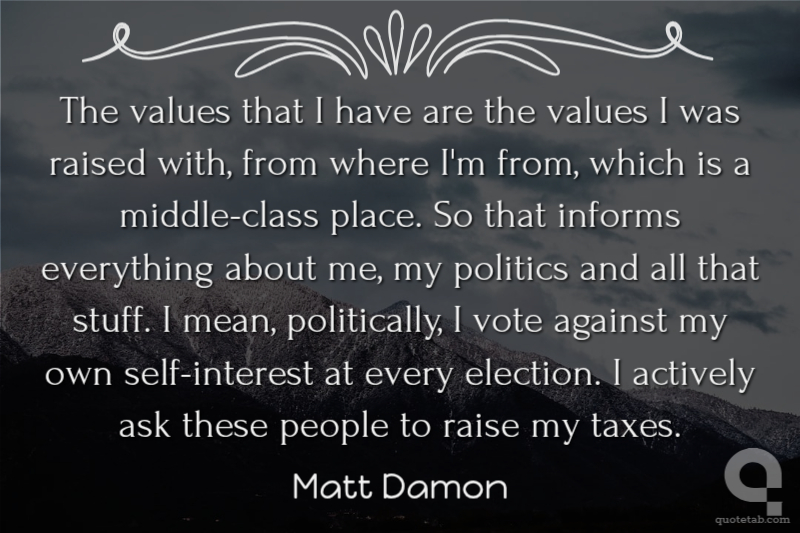 The values that I have are the values I was raised with, from where I'm from, which is a middle-class place. So that informs everything about me, my politics and all that stuff. I mean, politically, I vote against my own self-interest at every election. I actively ask these people to raise my taxes.