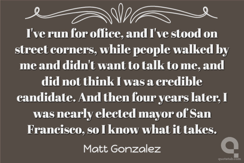 I've run for office, and I've stood on street corners, while people walked by me and didn't want to talk to me, and did not think I was a credible candidate. And then four years later, I was nearly elected mayor of San Francisco, so I know what it takes.