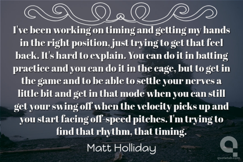 I've been working on timing and getting my hands in the right position, just trying to get that feel back. It's hard to explain. You can do it in batting practice and you can do it in the cage, but to get in the game and to be able to settle your nerves a little bit and get in that mode when you can still get your swing off when the velocity picks up and you start facing off-speed pitches. I'm trying to find that rhythm, that timing.