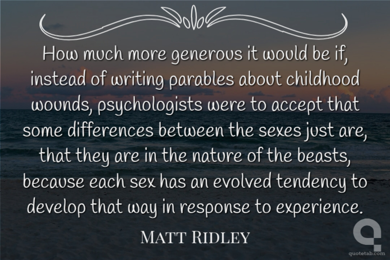 How much more generous it would be if, instead of writing parables about childhood wounds, psychologists were to accept that some differences between the sexes just are, that they are in the nature of the beasts, because each sex has an evolved tendency to develop that way in response to experience.