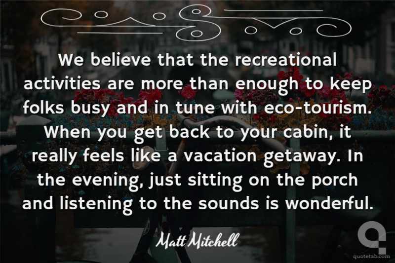 We believe that the recreational activities are more than enough to keep folks busy and in tune with eco-tourism. When you get back to your cabin, it really feels like a vacation getaway. In the evening, just sitting on the porch and listening to the sounds is wonderful.