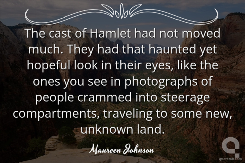 The cast of Hamlet had not moved much. They had that haunted yet hopeful look in their eyes, like the ones you see in photographs of people crammed into steerage compartments, traveling to some new, unknown land.