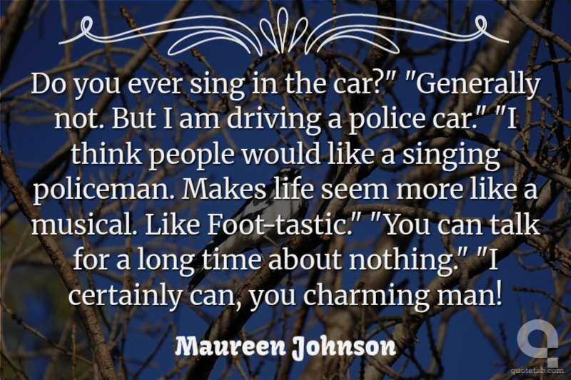 Do you ever sing in the car?" "Generally not. But I am driving a police car." "I think people would like a singing policeman. Makes life seem more like a musical. Like Foot-tastic." "You can talk for a long time about nothing." "I certainly can, you charming man!
