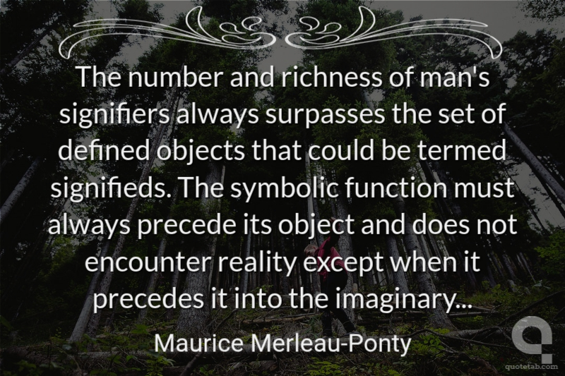 The number and richness of man's signifiers always surpasses the set of defined objects that could be termed signifieds. The symbolic function must always precede its object and does not encounter reality except when it precedes it into the imaginary...