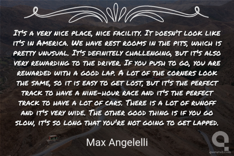 It's a very nice place, nice facility. It doesn't look like it's in America. We have rest rooms in the pits, which is pretty unusual. It's definitely challenging, but it's also very rewarding to the driver. If you push to go, you are rewarded with a good lap. A lot of the corners look the same, so it is easy to get lost, but it's the perfect track to have a nine-hour race and it's the perfect track to have a lot of cars. There is a lot of runoff and it's very wide. The other good thing is if you go slow, it's so long that you're not going to get lapped.