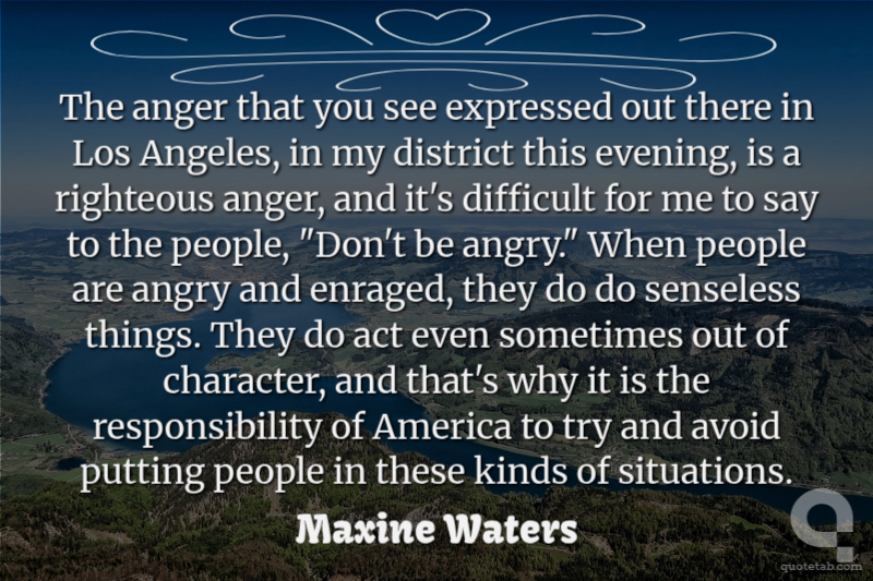 The anger that you see expressed out there in Los Angeles, in my district this evening, is a righteous anger, and it's difficult for me to say to the people, "Don't be angry." When people are angry and enraged, they do do senseless things. They do act even sometimes out of character, and that's why it is the responsibility of America to try and avoid putting people in these kinds of situations.