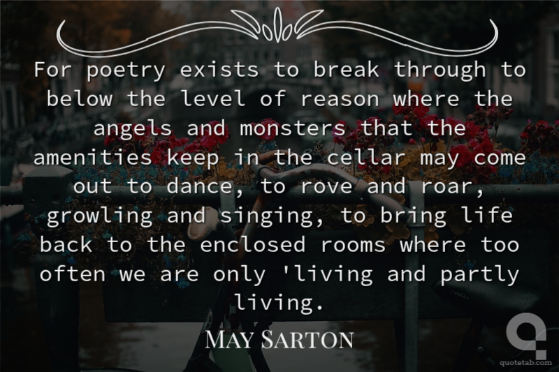 For poetry exists to break through to below the level of reason where the angels and monsters that the amenities keep in the cellar may come out to dance, to rove and roar, growling and singing, to bring life back to the enclosed rooms where too often we are only 'living and partly living.