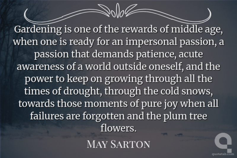 Gardening is one of the rewards of middle age, when one is ready for an impersonal passion, a passion that demands patience, acute awareness of a world outside oneself, and the power to keep on growing through all the times of drought, through the cold snows, towards those moments of pure joy when all failures are forgotten and the plum tree flowers.