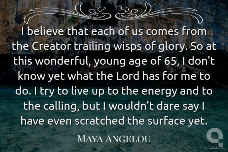I believe that each of us comes from the Creator trailing wisps of glory. So at this wonderful, young age of 65, I don't know yet what the Lord has for me to do. I try to live up to the energy and to the calling, but I wouldn't dare say I have even scratched the surface yet.