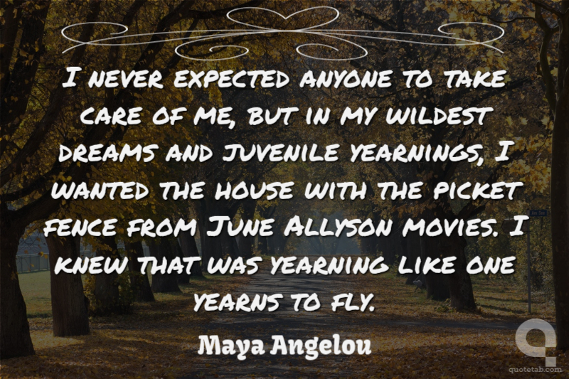 I never expected anyone to take care of me, but in my wildest dreams and juvenile yearnings, I wanted the house with the picket fence from June Allyson movies. I knew that was yearning like one yearns to fly.
