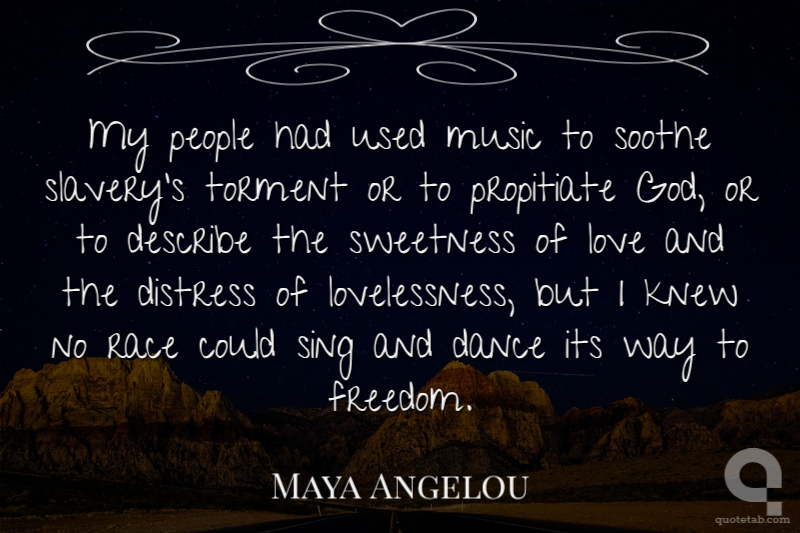 My people had used music to soothe slavery's torment or to propitiate God, or to describe the sweetness of love and the distress of lovelessness, but I knew no race could sing and dance its way to freedom.