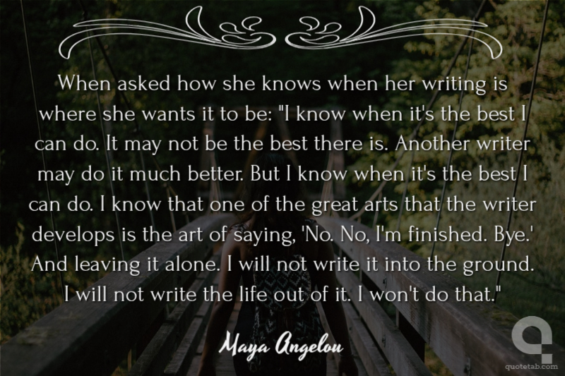 When asked how she knows when her writing is where she wants it to be: "I know when it's the best I can do. It may not be the best there is. Another writer may do it much better. But I know when it's the best I can do. I know that one of the great arts that the writer develops is the art of saying, 'No. No, I'm finished. Bye.' And leaving it alone. I will not write it into the ground. I will not write the life out of it. I won't do that."