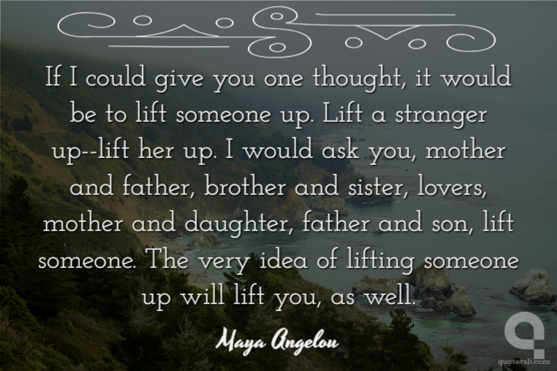 If I could give you one thought, it would be to lift someone up. Lift a stranger up--lift her up. I would ask you, mother and father, brother and sister, lovers, mother and daughter, father and son, lift someone. The very idea of lifting someone up will lift you, as well.