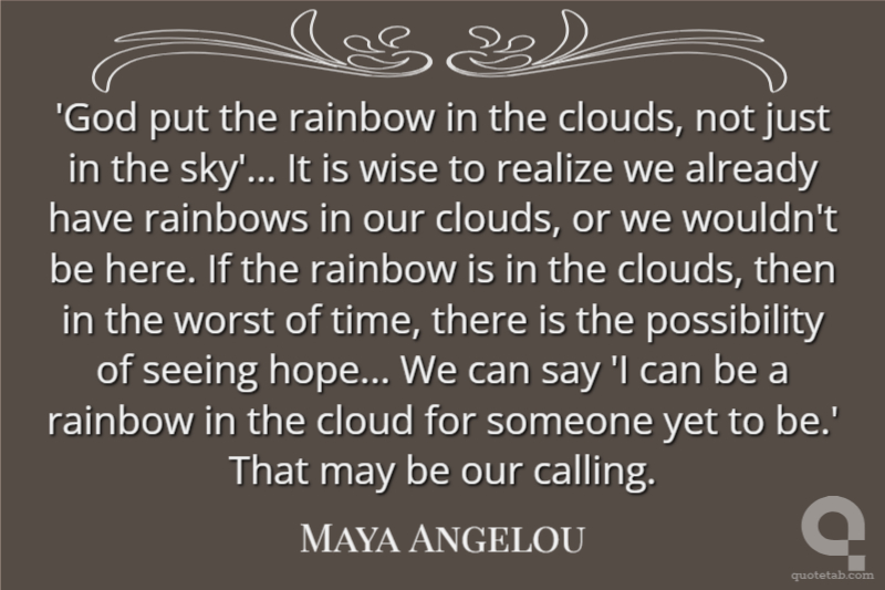'God put the rainbow in the clouds, not just in the sky'... It is wise to realize we already have rainbows in our clouds, or we wouldn't be here. If the rainbow is in the clouds, then in the worst of time, there is the possibility of seeing hope... We can say 'I can be a rainbow in the cloud for someone yet to be.' That may be our calling.