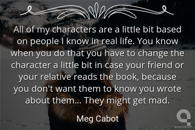 All of my characters are a little bit based on people I know in real life. You know when you do that you have to change the character a little bit in case your friend or your relative reads the book, because you don't want them to know you wrote about them... They might get mad.