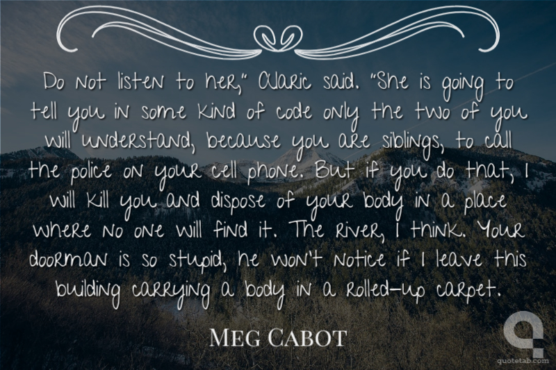 Do not listen to her," Alaric said. "She is going to tell you in some kind of code only the two of you will understand, because you are siblings, to call the police on your cell phone. But if you do that, I will kill you and dispose of your body in a place where no one will find it. The river, I think. Your doorman is so stupid, he won't notice if I leave this building carrying a body in a rolled-up carpet.