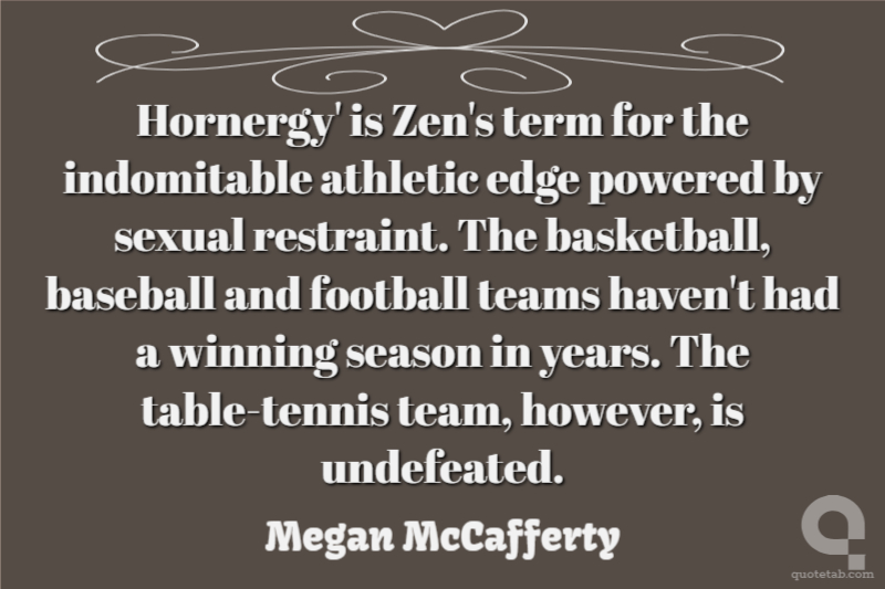 Hornergy' is Zen's term for the indomitable athletic edge powered by sexual restraint. The basketball, baseball and football teams haven't had a winning season in years. The table-tennis team, however, is undefeated.