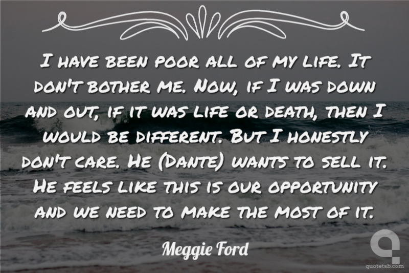 I have been poor all of my life. It don't bother me. Now, if I was down and out, if it was life or death, then I would be different. But I honestly don't care. He (Dante) wants to sell it. He feels like this is our opportunity and we need to make the most of it.