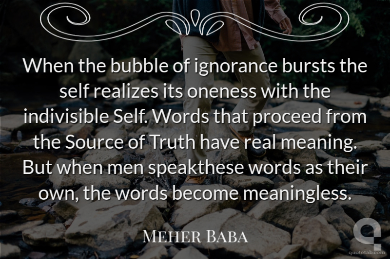 When the bubble of ignorance bursts the self realizes its oneness with the indivisible Self. Words that proceed from the Source of Truth have real meaning. But when men speakthese words as their own, the words become meaningless.