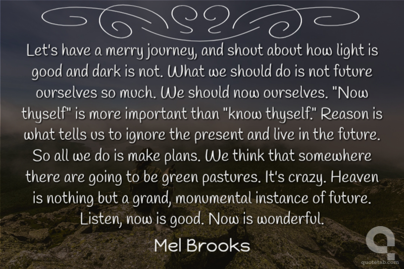 Let's have a merry journey, and shout about how light is good and dark is not. What we should do is not future ourselves so much. We should now ourselves. "Now thyself" is more important than "know thyself." Reason is what tells us to ignore the present and live in the future. So all we do is make plans. We think that somewhere there are going to be green pastures. It's crazy. Heaven is nothing but a grand, monumental instance of future. Listen, now is good. Now is wonderful.