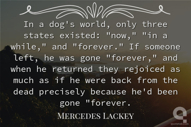In a dog's world, only three states existed: "now," "in a while," and "forever." If someone left, he was gone "forever," and when he returned they rejoiced as much as if he were back from the dead precisely because he'd been gone "forever.