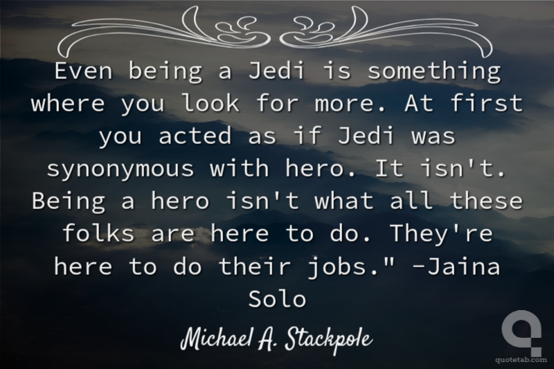 Even being a Jedi is something where you look for more. At first you acted as if Jedi was synonymous with hero. It isn't. Being a hero isn't what all these folks are here to do. They're here to do their jobs." -Jaina Solo