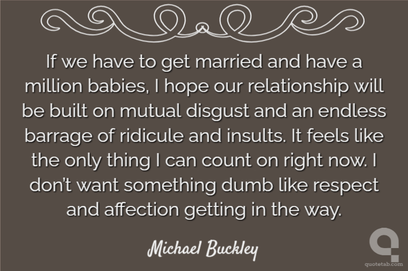 If we have to get married and have a million babies, I hope our relationship will be built on mutual disgust and an endless barrage of ridicule and insults. It feels like the only thing I can count on right now. I don’t want something dumb like respect and affection getting in the way.