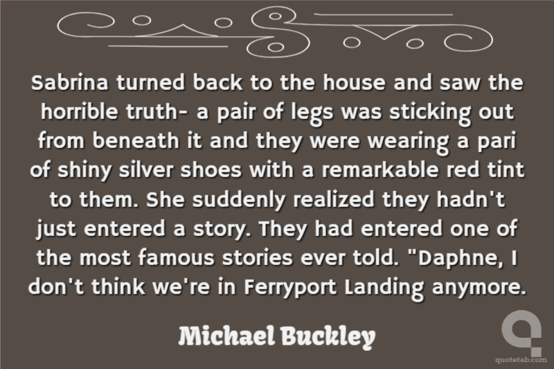 Sabrina turned back to the house and saw the horrible truth- a pair of legs was sticking out from beneath it and they were wearing a pari of shiny silver shoes with a remarkable red tint to them. She suddenly realized they hadn't just entered a story. They had entered one of the most famous stories ever told. "Daphne, I don't think we're in Ferryport Landing anymore.