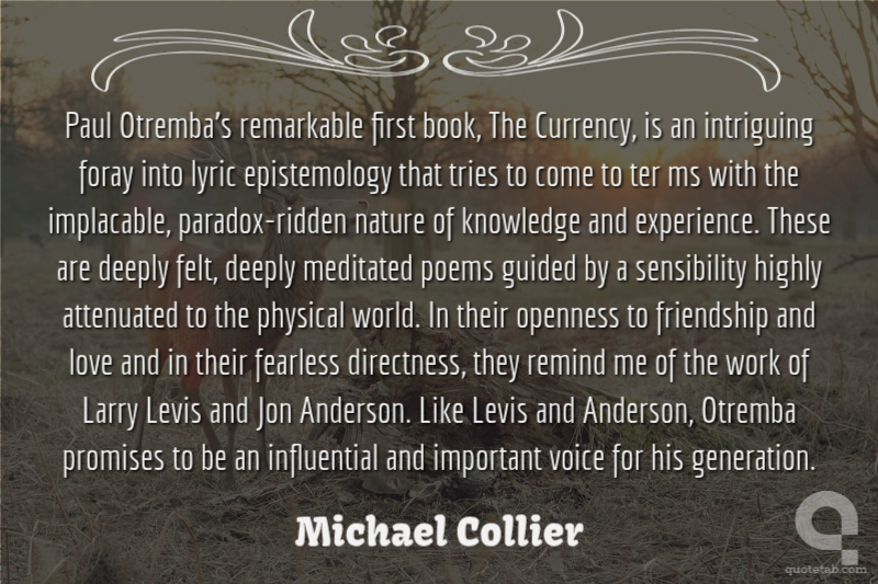 Paul Otremba’s remarkable first book, The Currency, is an intriguing foray into lyric epistemology that tries to come to ter ms with the implacable, paradox-ridden nature of knowledge and experience. These are deeply felt, deeply meditated poems guided by a sensibility highly attenuated to the physical world. In their openness to friendship and love and in their fearless directness, they remind me of the work of Larry Levis and Jon Anderson. Like Levis and Anderson, Otremba promises to be an influential and important voice for his generation.