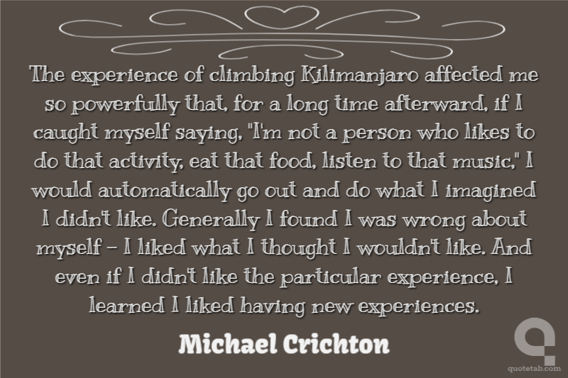 The experience of climbing Kilimanjaro affected me so powerfully that, for a long time afterward, if I caught myself saying, "I'm not a person who likes to do that activity, eat that food, listen to that music," I would automatically go out and do what I imagined I didn't like. Generally I found I was wrong about myself - I liked what I thought I wouldn't like. And even if I didn't like the particular experience, I learned I liked having new experiences.