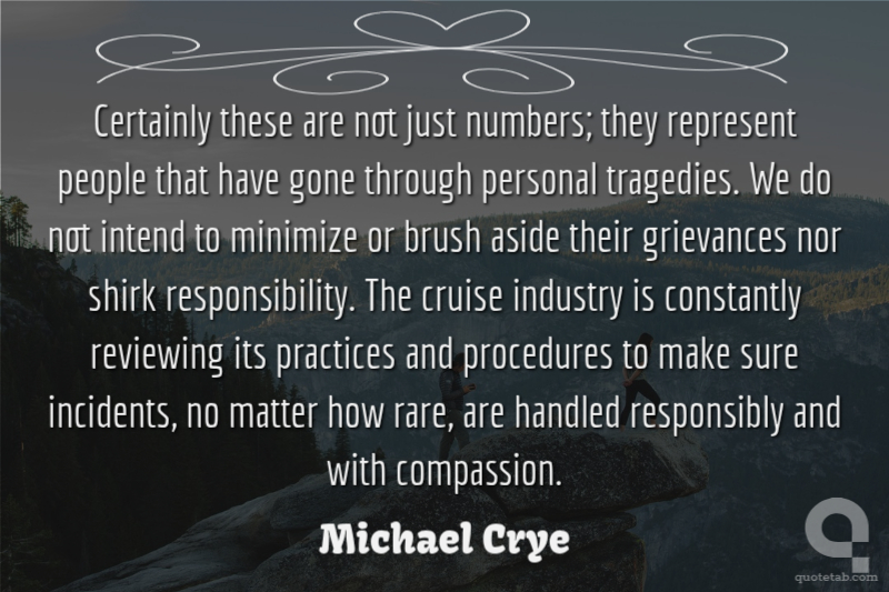 Certainly these are not just numbers; they represent people that have gone through personal tragedies. We do not intend to minimize or brush aside their grievances nor shirk responsibility. The cruise industry is constantly reviewing its practices and procedures to make sure incidents, no matter how rare, are handled responsibly and with compassion.