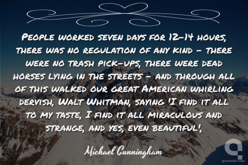 People worked seven days for 12-14 hours, there was no regulation of any kind - there were no trash pick-ups, there were dead horses lying in the streets - and through all of this walked our great American whirling dervish, Walt Whitman, saying 'I find it all to my taste, I find it all miraculous and strange, and yes, even beautiful',